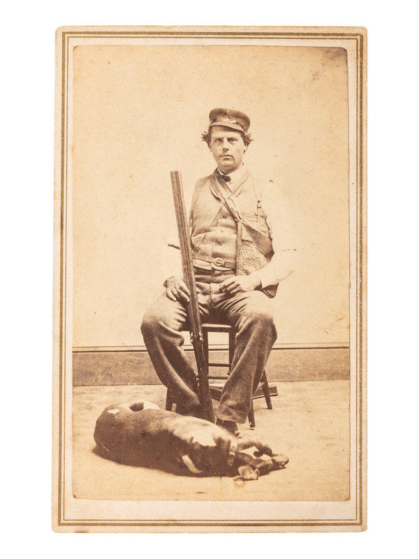 2 1/16 x 3 1/2 in. CDV on cardstock mount (toning, surface soil, light wear to mount edges and corners). A portrait of a hunter seated in a studio setting with rifle in hand, carrying a satchel, with his dog resting at his feet.