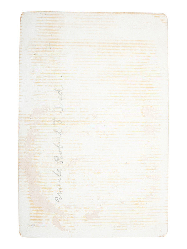 3 7/8 x 5 1/2 in. albumen photograph on cardstock mount (good contrast, mount with light soiling and wear to edges and corners). Mount recto bears Dickey's imprint. Pencil inscription to verso reads, "Uncle Robert & Fred." A pair of furniture makers and/or repairmen pose as though they are working on two wooden chairs. One holds a hammer and the other holds a paintbrush.