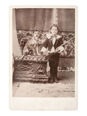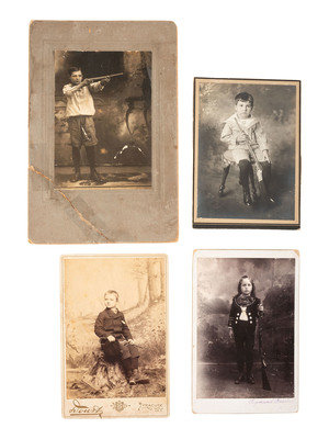 Cabinet photograph of a young, well-dressed child standing in a studio, holding a BB gun in one arm while holding a small pup beside him on a leash. Sheffield, IL: Carroll, n.d. -- Cabinet photograph of a young, well-dressed lad posed with a BB gun in hand. Tremont, PA: Sigmund Gaertner, n.d. (few surface scratches to print; corner wear to mount). -- Cabinet card of young boy seated on a tree stump in a studio setting with a BB gun on his lap. Syracuse, NY: J. Doust, n.d. (toning, few stains to print). -- Seated portrait of a young boy wearing a striped blouse and shorts, holding a BB gun. Uncredited. -- Photograph on large mount showing a young boy in short pants, aiming his gun at an unknown target. Uncredited (few nicks to surface of print; soiling and significant wear to mount, including tape repair to lower left corner, previously separated).