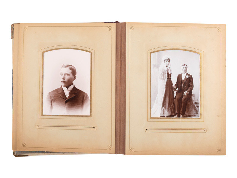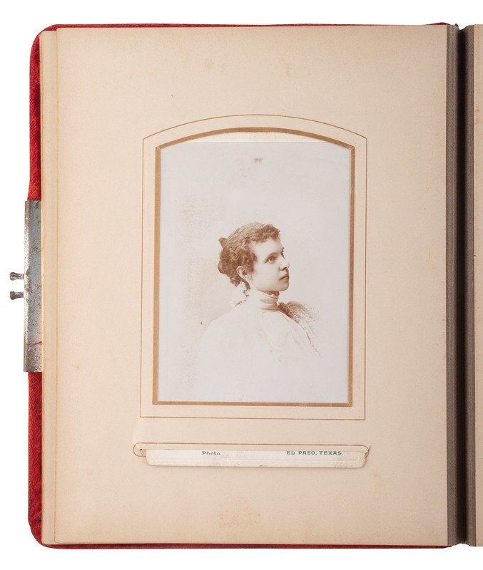[With:] 8 1/2 x 10 3/4 in. white lacquered paper album with metal clasp (clasp loose, some wear to edges, light soil). Housing 15 cabinet photographs, 10 CDVs, and 4 real photo postcards.