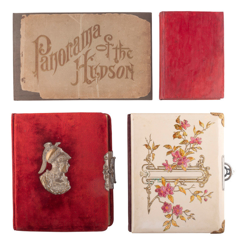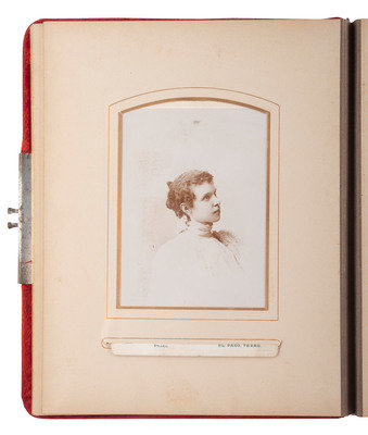 8 1/2 x 10 5/8 in. red velvet album with metal clasp and bust of a classical soldier to front board (minor wear at extremities, slightly leaned). Housing 25 cabinet cards, 6 tintypes, and 6 CDVs.