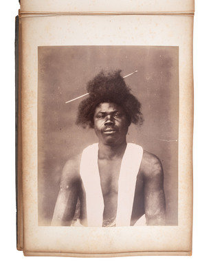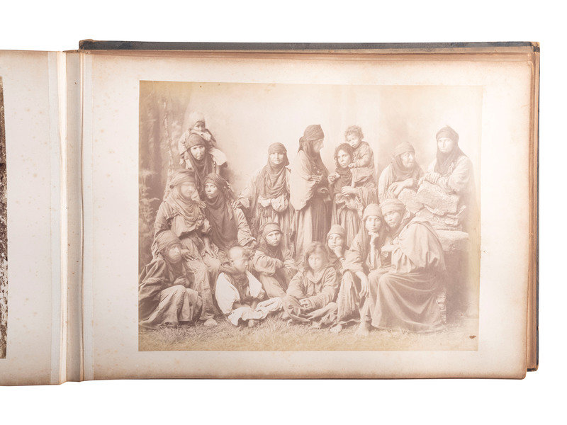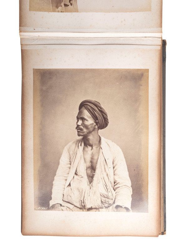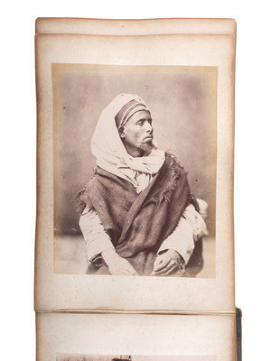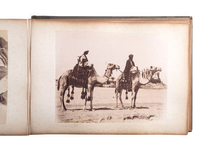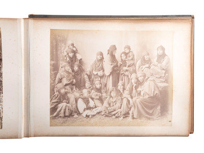 Oblong large quarto (11 x 15 in.) 275 x 285 mm. 50 albumen photographs, of which 21 measure 8 1/2 x 11 in., with the remaining images ranging in size from 2 1/4 x 3 3/4 in. to 6 1/2 x 8 3/4 in. The photographs are mounted recto/verso to 10 1/4 x 14 in. album pages. (toning, soiling and spotting to prints; toning, some areas of significant soiling, and spotting to album pages, which have detached from binding). Half morocco gilt (lacking spine, sigificant wear to extremities). Some photographs are titled in negative, lower margin of print, or captioned in pencil on album page.