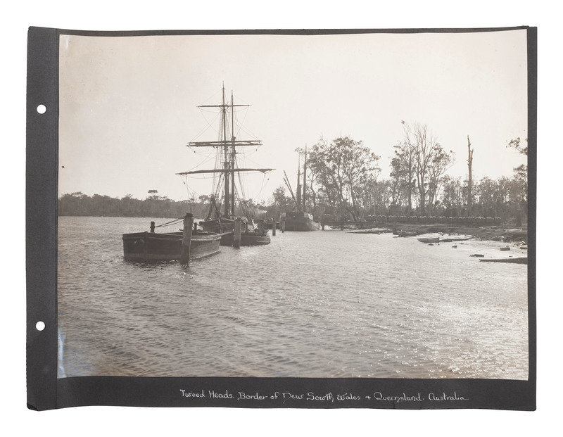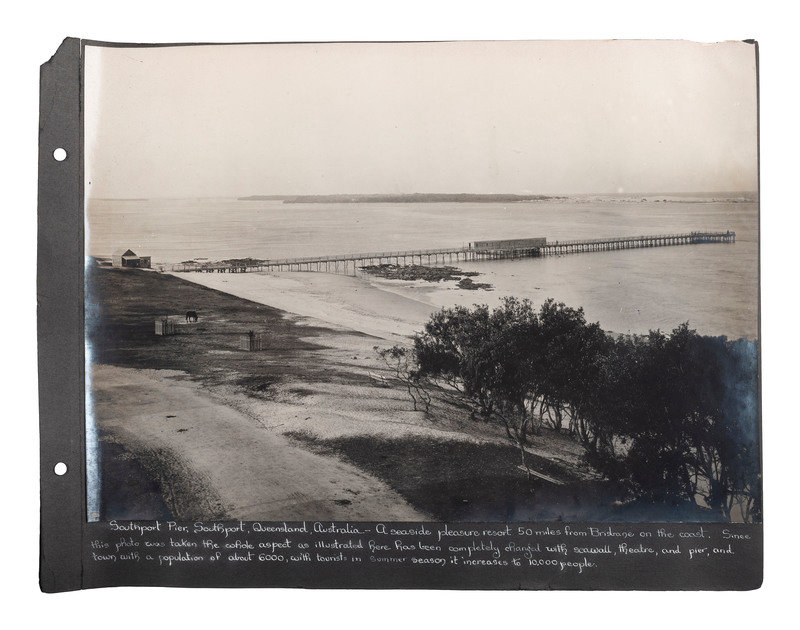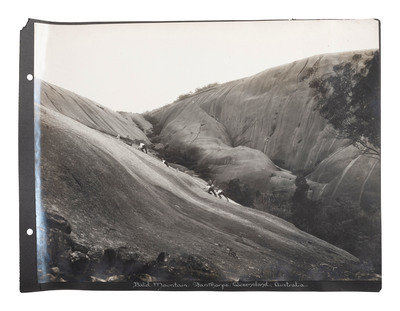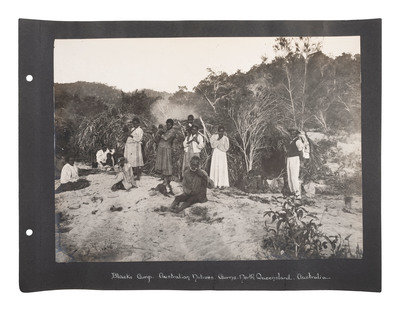 Oblong large quarto (11 x 15 in.) 285 x 385 mm. 45 silver gelatin photographs, 10 1/2 x 13 3/4 in., mounted recto to 11 x 14 in. album pages (toning, some prints with light soiling, chipping and some edge loss to prints, album pages loose, brittle, with corner and edge wear including chipping and loss). Cloth flexible boards with "Photographs" in gilt, and "of Queensland Australia" written below (disbound, wear to extremities). Manuscript caption on mount below each photograph.
