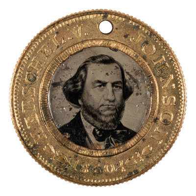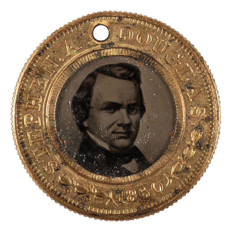 15/16 in. diam. gilt brass frame featuring 9/16 in. diam. ferrotypes of Stephen Douglas and Herschel Johnson on obverse and reverse, respectively (scratching to Johnson side, darkening to Douglas side, tarnish to frame). Obverse with legend "Stephen A. Douglas / 1860," reverse with legend, "Herschel V. Johnson / 1860." Frame with hole at top for suspension.