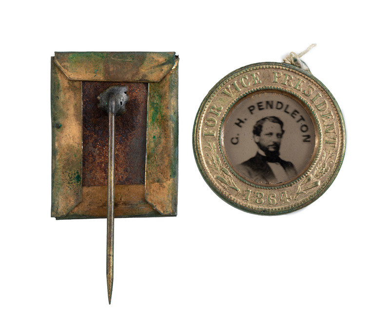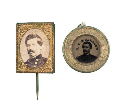 [POLITICS]. A group of 2 campaign items promoting George McClellan, incl. stick pin and McClellan and Pendleton back-to-back ferrotype badge. 1864.