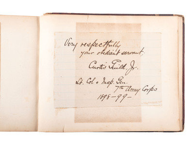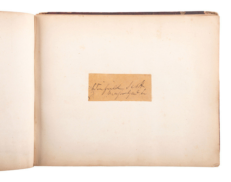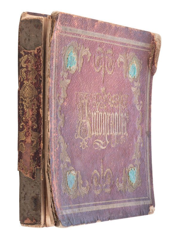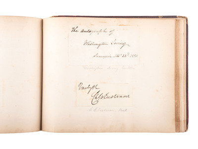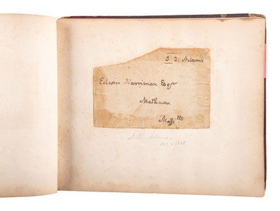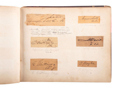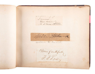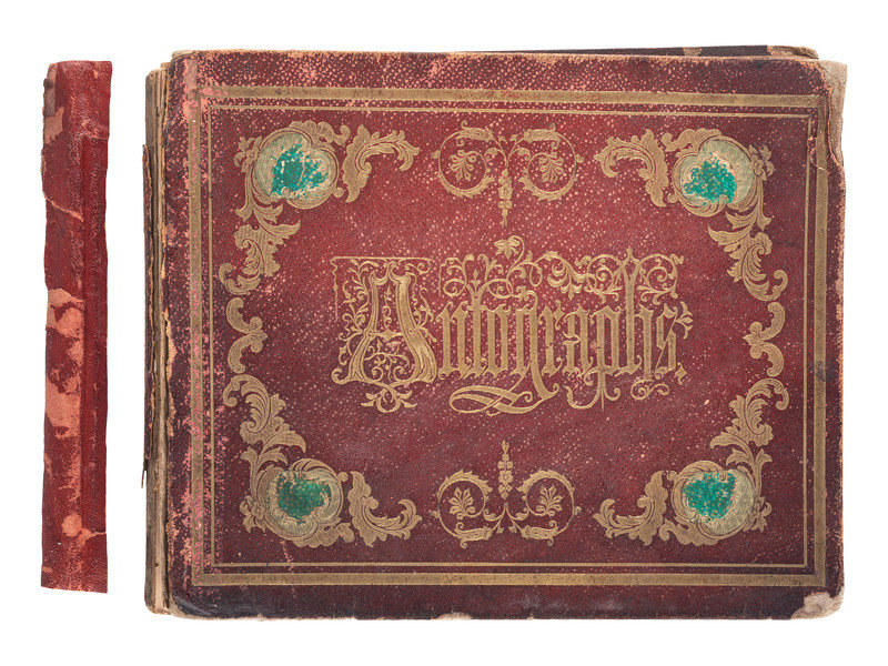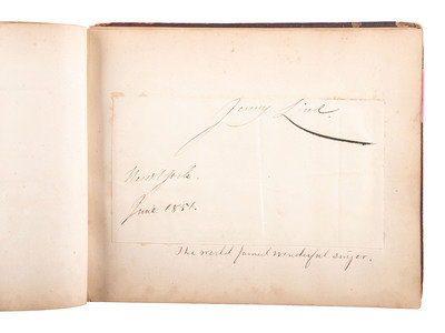 8 1/8 x 6 3/4 in. autograph album with embossed leather-covered boards and gilt title, identified to Lucritia Taft Flagg of "Kennilworth Castle, Holyoke Mass." (Front cover fully separated from album, portion of spine missing, wear to extremities, spotting, chipping, and toning to pages, few loose pages.) Album contains 103 autographs, some clipped and pasted to album pages, other written directly on album pages. Autographs include Jenny Lind ("Jenny Lind. New York. June. 1851") -- Lewis Cass ("Lew Cass") --