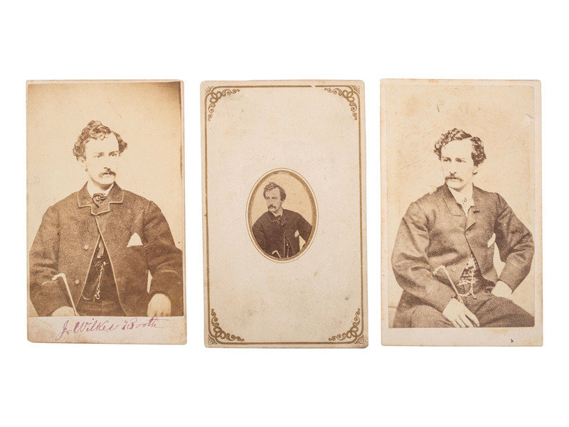 Portraits include: The "Wanted" poster portrait of Booth, approx. 1 x 1 1/4 in. (sight), under paper mat, uncredited. Provenance: Keesler/Dow Collection (consignor's modern typed label). -- 2 seated portraits of Booth, one with "Joseph Ward" ink stamp to verso, the other carte uncredited.
