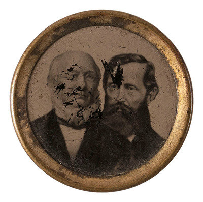 17 mm. dia. (including rim) jugate button featuring ferrotype of Horace Greeley and B. Gratz Brown (scratching to image, varied patination to rim and button verso). The candidates' bust portraits are featured next to one another, Greeley being on the left and Brown being on the right.