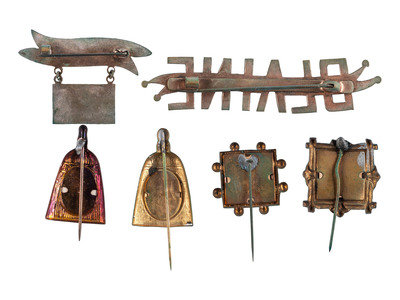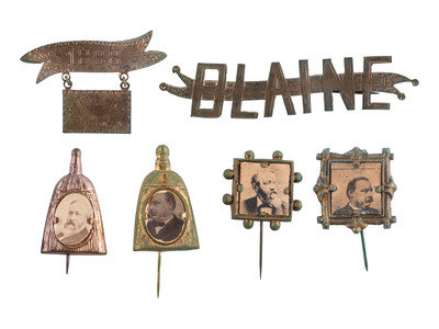 2 "clean sweep" pinbacks, each containing an oval miniature paper portrait of Harrison and Cleveland, each housed in 1 3/8 in. tall embossed brass shell in form of a broom (edge wear to portrait of Cleveland). -- 2 stickpins, each containing a square miniature paper portrait of Harrison and Cleveland, each housed in 1 3/8 in. tall brass shell frame (toning to portraits). -- 2-part brass badge, with riband on top inscribed, "1888," and rectangular panel suspended below, inscribed "Cleveland and Thurman," 1 x 1 1/2 in. (some tarnish). -- "Blaine" brass pinback, 3/4 x 3 in. (some tarnish).