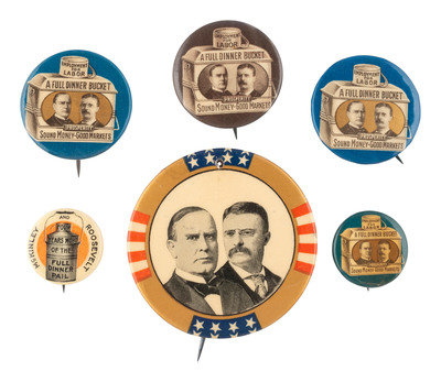 [POLITICS]. A group of 6 jugate campaign buttons promoting William McKinley and Theodore Roosevelt, incl. various examples of "A Full Dinner Bucket."