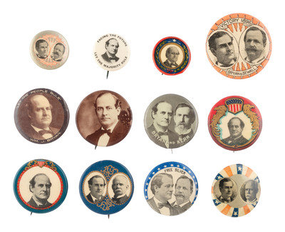 [BRYAN, William Jennings (1860-1925)]. A group of 12 buttons, incl. single and jugate campaign examples featuring Bryan with Sewall, Stevenson, and Kern.