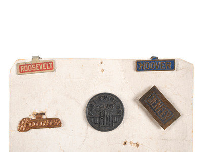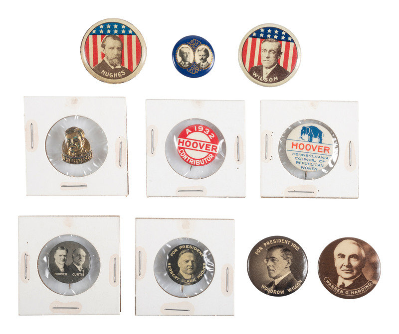[With:] 5 buttons promoting Herbert Hoover, measuring 1 in. dia., or smaller, including: Jugate featuring bust portraits of Hoover and Curtis. -- "For President / Herbert Clark Hoover" button featuring bust portrait. -- "Hoover / Pennsylvania Council of Republican Women" button, with elephant. -- "Hoover / A 1932 Contributor" button. -- Stud featuring bust portrait of Hoover (some tarnish).