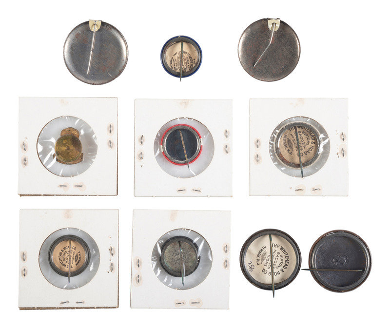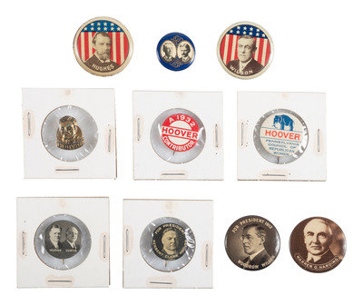Pair of matching buttons, the first featuring a bust portrait of Woodrow Wilson, the second featuring a portrait of Charles Evans Hughes, each presented against a patriotic backdrop comprised of white stars on blue and red and white stripes, 1 1/4 in. dia. (toning, blue in Hughes button slightly faded, pins somewhat loose on reverse side). -- Jugate button featuring portraits of Wilson and Marshall against a blue background, with gold highlights, 7/8 in. dia. -- "For President 1912 / Woodrow Wilson" button featuring portrait of Wilson, 1 1/4 in. dia.