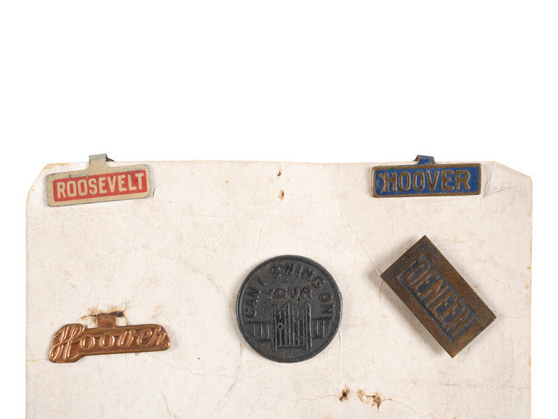 [With:] 2 tab badges promoting "Hoover." -- 1 tab badge promoting "Roosevelt." -- Clip promoting "Deneen." - Stud with slogan, "Can I Swing on your [door]" with depiction of door.