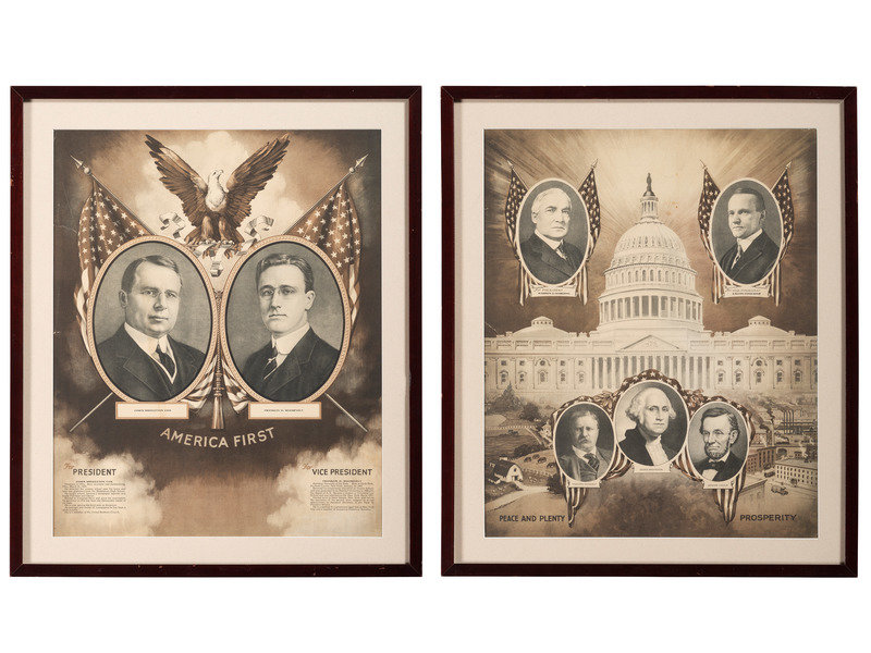 2 lithograph broadsides with jugate portraits, 1920, visible 15 5/8 x 19 3/16 in. on wove paper,some creasing, tear to left edge of Republican example, matted and framed to 19 5/8 x 23 3/8 in. (not examined out of frames.