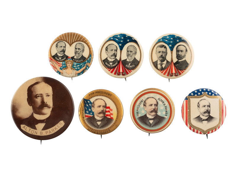 [Also with:] 2 jugate buttons, each 1 1/4 in. dia., the first features portraits of Parker and Davis, the second features portraits of Theodore Roosevelt and Charles W. Fairbanks. The portraits of both pairs of candidates are positioned against the same patriotic backdrop (light toning, light edge wear, original back papers).