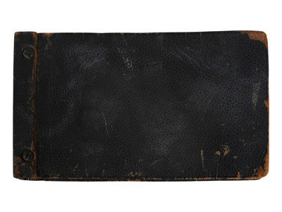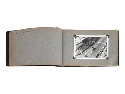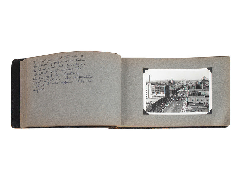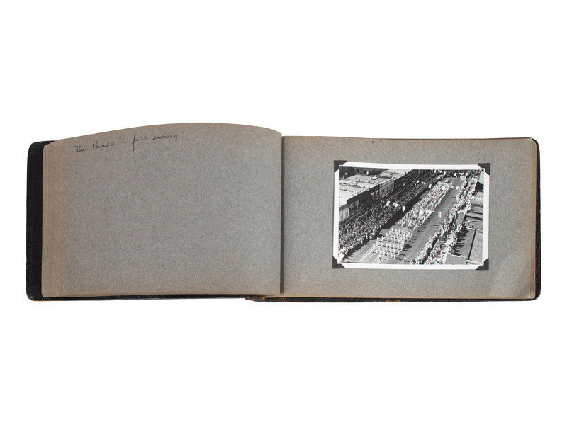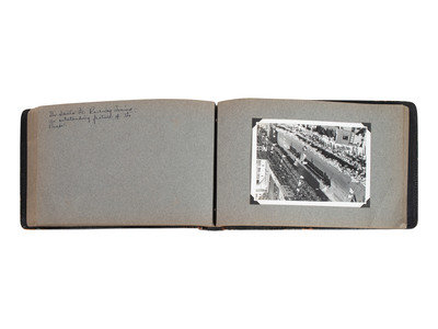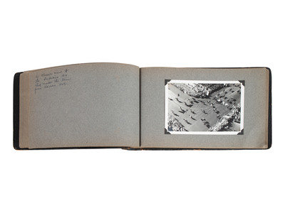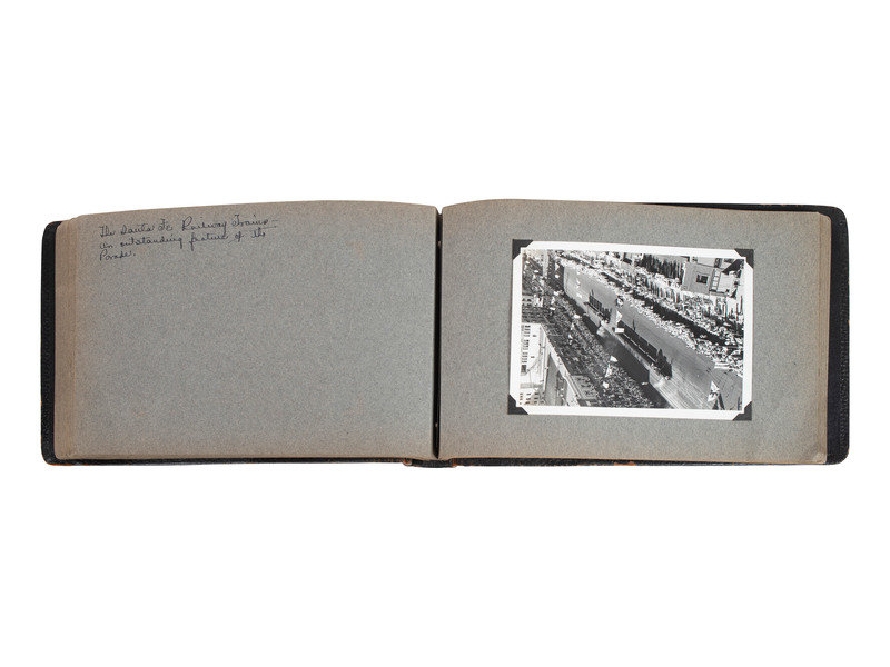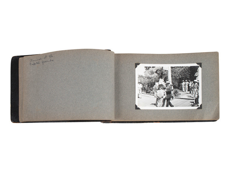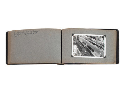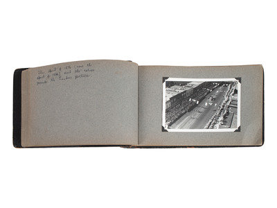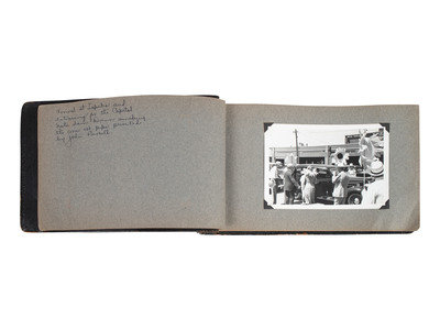 Scrapbook, brown leather, obl. 7 x 12" (approx.) with 27 photographs (4-1/2 x 6-1/2") with ink hand-written captions on the facing pages.
