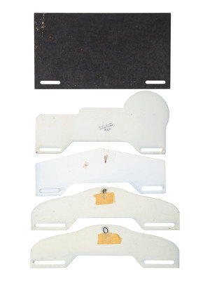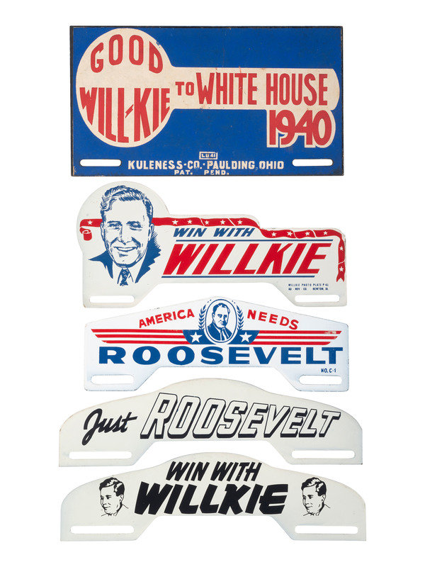 [With:] "Win with Willkie" metal license plate attachment, with portraits of Willkie, 11 x 3 in. (some wear, minor areas of paint loss near edges). -- "Win with Willkie" metal license plate attachment, with portrait of Willkie, 10 x 4 3/4 in. (wear near edges). -- "Good Willkie to White House 1940" metal license plate, 10 x 5 1/2 in. (some surface wear, tarnish).