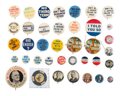 [With:] 23 buttons, many featuring slogans against Roosevelt running for third and fourth terms. Ranging in size from 3/4 in. to 1 3/4 in., including "Two Good Terms Deserves a Rest". 1 1/4 in. dia. -- "Third International. Third Reich. Third Term???" 1 1/4 in. dia. (some toning). -- 'The Constitutionalists / No Third Term." 7/8 in. (minor brown spotting). -- "No More Fireside Chats." 1 1/4 in. dia. (minor toning).