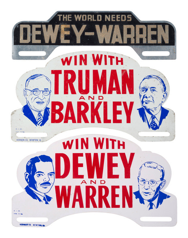 [POLITICS]. A group of 3 campaign license plate attachments promoting Dewey & Warren and Truman & Barkley. 1948.