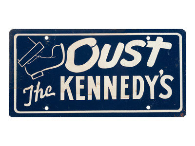 Oust the Kennedy's. 6 x 12 in. metal license plate (some light soiling, oxidation). Anti-second term license plate urging voters not to vote for John F. Kennedy for a second term in 1964.
