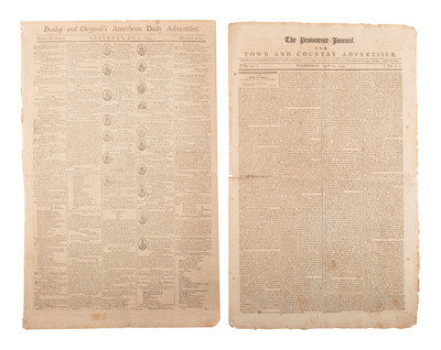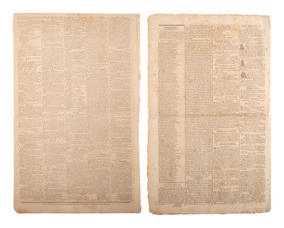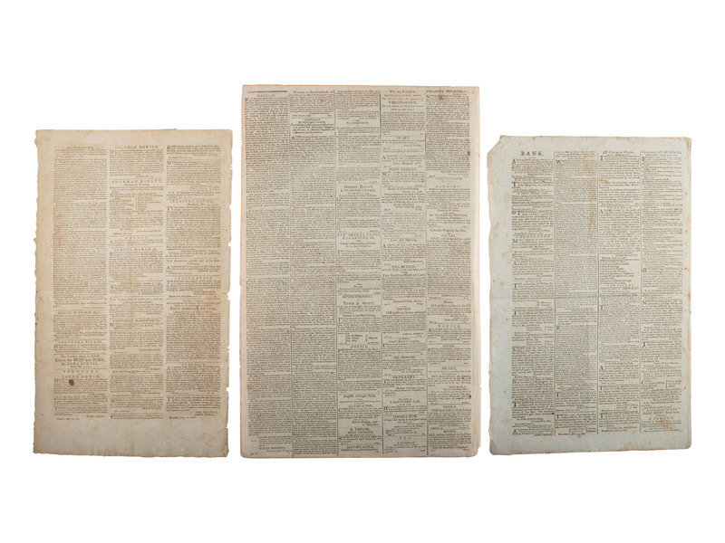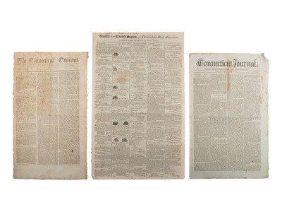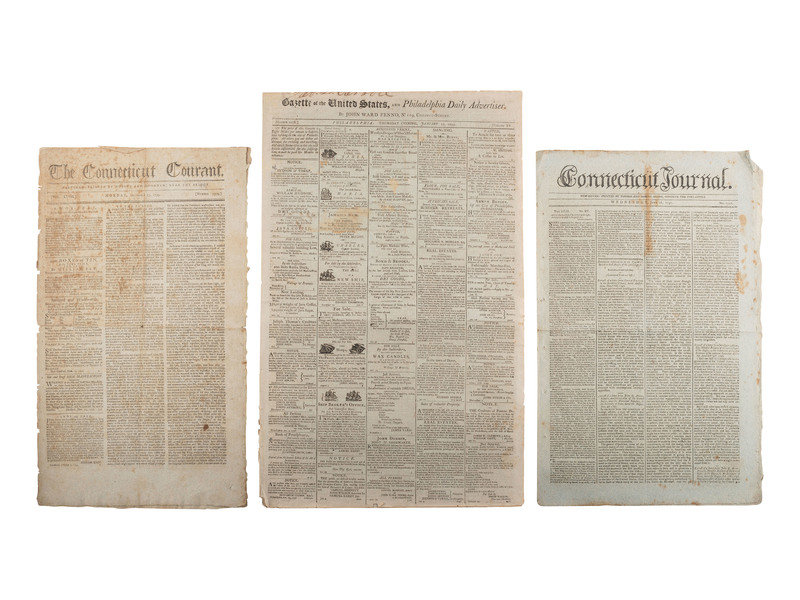Papers with a variety of news and details related to the young republic. The 1793 Connecticut Courant reports on the Senate response to President Washington's re-election: “Your reelection to the chief magistracy of the United States gives us sincere pleasure….It as an event every way propitious to the happiness of our country; and your compliance with the call, as a fresh instance of the patriotism which is so repreatedly led you to sacrifice private inclination to the public good." Message signed in type “John Adams, Vice President of the United States and President of the Senate.” Washington's reply: “…the pleasure expressed by the Senate on my reelection to the station which I feel commands my sincere warmest acknowledgments – if this be an event which promises the smallest addition to the happiness of our country, as it is my duty, so shall it be my study to realize the expectation.” Signed in type “Go. Washington.” Message from the House of Representatives December 6, 1793: “Sir, the representatives of the people United States in meeting you for the first time since you have been again called by a unanimous suffrage to your present station, finds an occasion which they embrace with no less sincerely than promptitude, or expressing to you their congratulations on so distinguished a testimony of public approbation, and their entire confidence in the purity and patriotism of the motives which have produced obedience to the voice of your country.