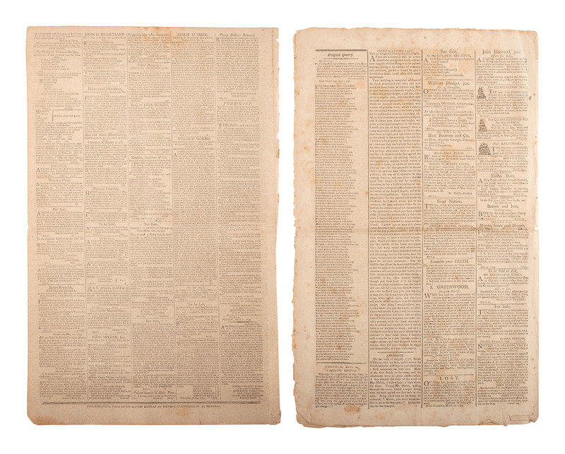 The Connecticut Courant. Vol. XXVIII, No. 1509. Hartford [CT]: Hudson and Goodwin, 23 December 1793. -- Dunlap and Claypoole's American Daily Advertiser. No. 4729. Philadelphia [PA]: J. Dunlap and D.C. Claypoole, 7 June 1794. -- The Connecticut Journal. No. 1548. New Haven [CT]: Thomas and Samuel Green, 28 June 1797. -- Gazette of the United States, and Philadelphia Dauly Advertiser. Vol. XV, Number 1976. Philadelphia [PA]: John Ward Fenno, 17 January 1799. -- The Providence Journal and Town and Country Advertiser, Vol. I, No. 15. Providence [RI]: John Carter, 10 April 1799.