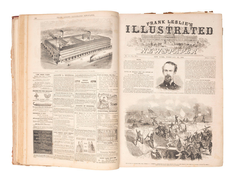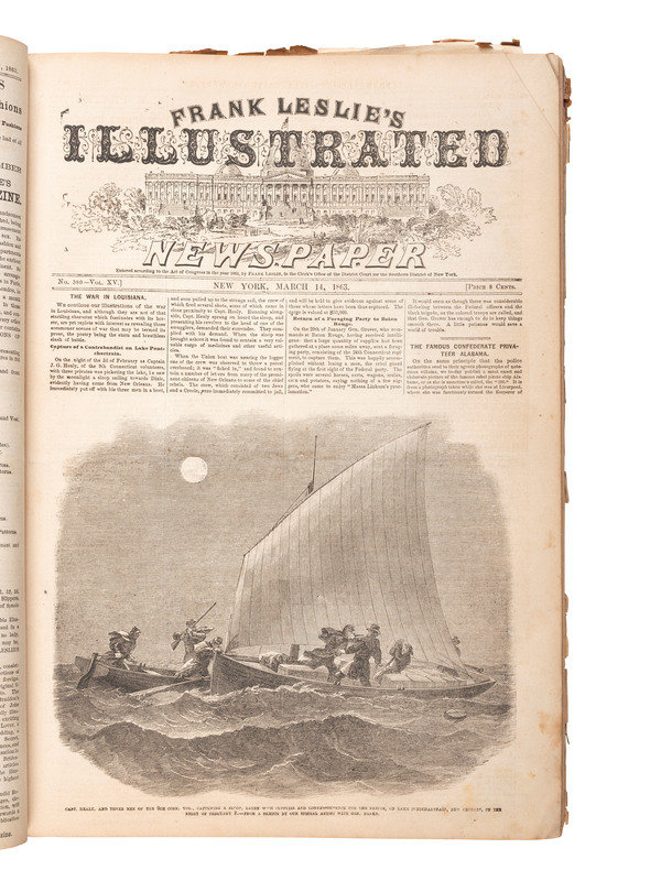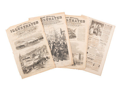 [Also with:] Large collection of approximately 250 single leaves from war-date Harper's Weekly and Frank Leslie's Illustrated Newspaper. Majority 1861-1865. Includes illustrations, both front page and double-page. (Varies, toning, many with marginal chipping and tears, some more significant, creasing).