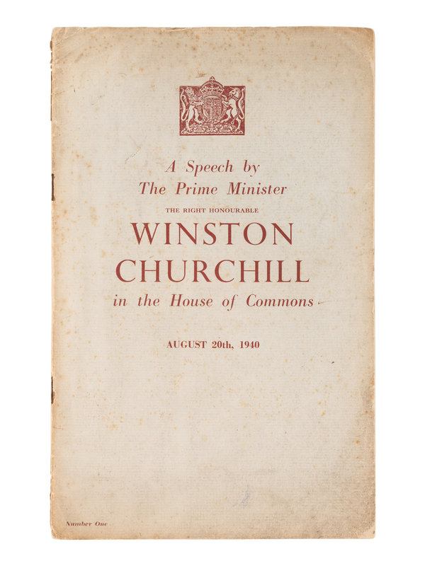 CHURCHILL, Winston L. S., Sir (1874-1965). A Speech by the Prime Minister The Right Honourable Winston Churchill in the House of Commons August 20th, 1940. [London: Bayard Press for the Ministry of Information, 1940].