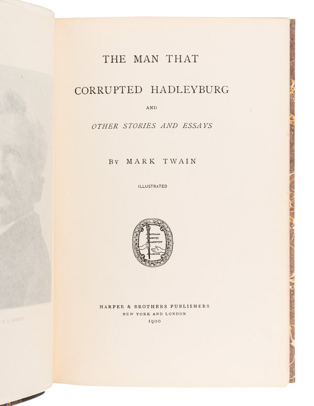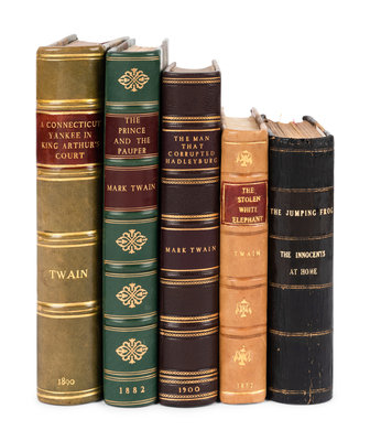 A Connecticut Yankee in King Arthur's Court. NY, 1890. Second edition. -- The Prince and the Pauper. Boston, 1882. BAL 3402. -- The Man that Corrupted Hadleyburg. NY & L, 1900. BAL 3459. -- The Stolen White Elephant, Etc. Boston, 1882. BAL 3404. -- The Celebrated Jumping Frog of Calaveras County, and other Stories. L, 1867. BAL 3586. [Bound with:] The Innocents at Home. L, [1872]. "Copyright edition." BAL 3336. -- [Also bound with:] The Innocents Abroad a Book of Travel in Pursuit of Pleasure. The Voyage Out. L, [1870]. BAL 3590. -- Together, 7 works in 5 volumes, various 16mo,12mo, and 8vo sizes, all in 20th-century half calf or quarter morocco bindings, most FIRST AMERICAN or FIRST ENGLISH EDITIONS, condition generally fine.