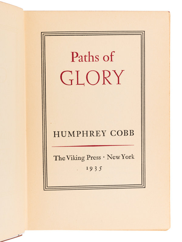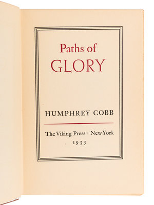 FIRST EDITION, FIRST ISSUE of Cobb's first work, written while he worked at an advertising agency in New York City following his service in the First World War. Paths of Glory is based on the Souain corporals affair in which four French soldiers were executed by firing squad as an example to the rest of the French Army; the book was later adapted into Stanley Kubrick's 1957 film of the same name.