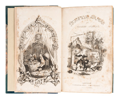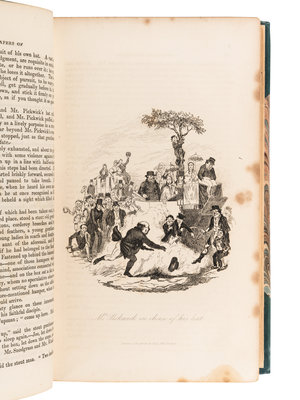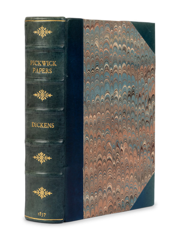 FIRST EDITION, BOUND FROM THE ORIGINAL PARTS, third issue with signature E on p.25 and pagination on p.26, and Hatton & Cleaver's Variant B with "inbe-licate"and "inscriptino" on p.341 lines 1 and 5, and "S. Veller" on p.342 line 5. With most plates in Hatton & Cleaver's second state. Lacking both suppressed plates in part 3 but with two later plates not mentioned in Hatton & Cleaver: "The fat boy awake on this occasion only" (facing p.73) and "Mr. Wardle & his friends under the influence of 'the Salmon,'"(facing p.76). Eckel pp. [23]- 50; Gimbel A15; Hatton & Cleaver, pp. 3-88; Smith I:3.