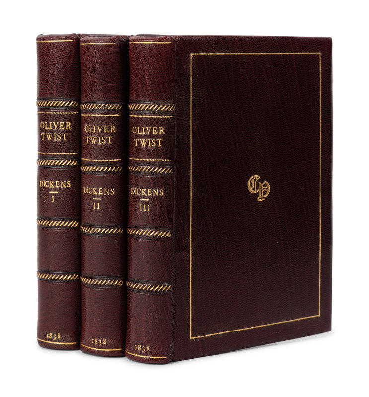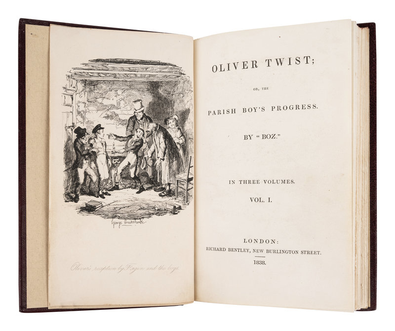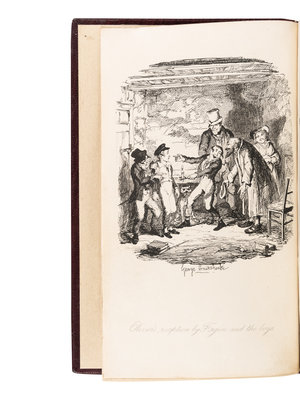 FIRST EDITION, FIRST ISSUE OF THE FIRST ENGLISH NOVEL TO FEATURE A YOUNG CHILD AS A PROTAGONIST, with "Boz" on the title-page and the "Fireside" plate and nearly all early issue points listed in Smith. When Bentley decided to publish Oliver Twist in book format before completing its completion in Bentley's Miscellany magazine, Cruikshank had to rush to complete the illustrated plates. Dickens did not review the plates until the eve of publication, and he objected to the "Fireside" plate which depicted Oliver at Rose Maylie's knee with Harry and Mrs. Maylie gathered around the living room fire. Cruikshank revised the illustration, using the same title ("Rose Maylie and Oliver"), to show Rose and Oliver standing before Oliver's mother's church memorial. The altered plate was used in later issues of Oliver Twist in book form, as well as in the conclusion of the periodical run. Eckel, p.51-[57]; Gimbel A27; Smith I:4.