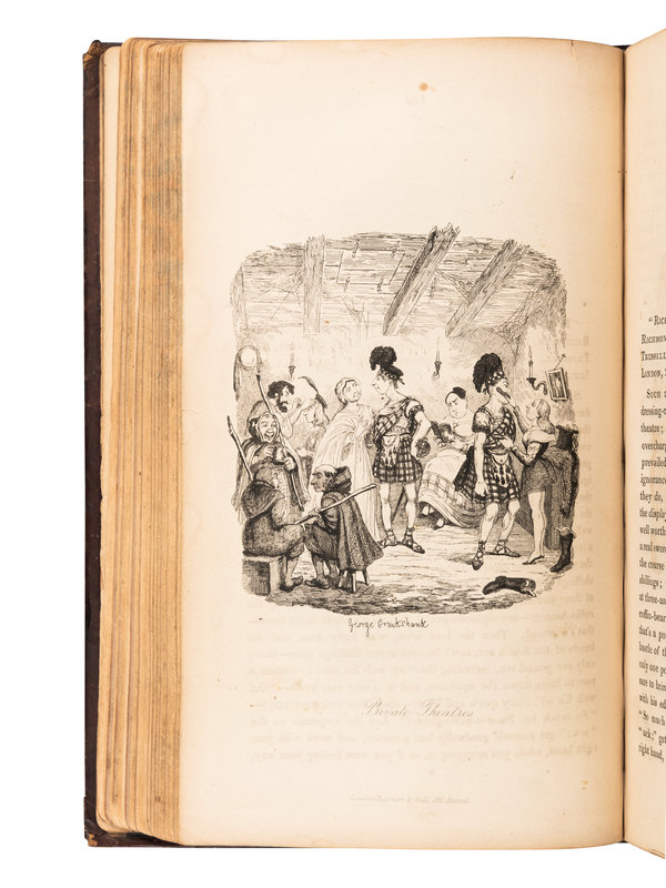 FIRST OCTAVO ONE-VOLUME EDITION, early issue with title-page lacking comma after "illustrations" and the publisher's address as "186, Strand" (Gimbel) and with first state engraved title-page bearing the publishers' name and address with no date (Eckel, p.19). Issued by Chapman and Hall in May 1839, the present one-volume edition of both series includes 13 additional illustrations (see Smith I:2, p. 16) and, as called for by Eckel, all the plates before p.120 "Greenwich Fair" are without the publisher's name and all after are marked "London, Chapman & Hall, 186, Strand." Eckel, pp. 19-22; Gimbel A7.