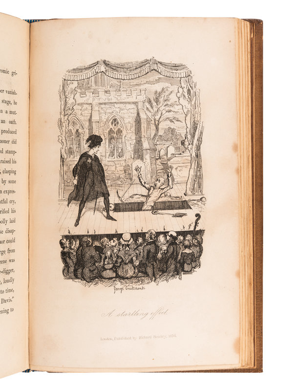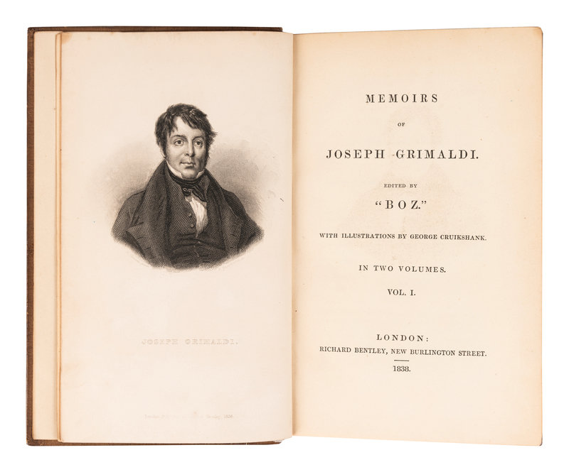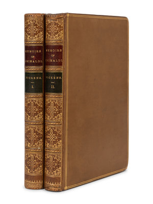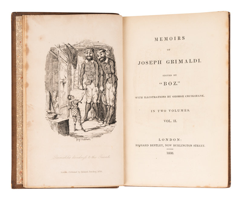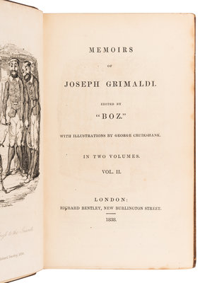 [With:] DICKENS, editor. Memoirs of Joseph Grimaldi. London: Richard Bentley, 1838. 2 volumes, 8vo (196 x 120 mm). Half-titles, engraved portrait frontispiece after J. Raven, and 12 etched plates by and after George Cruikshank. (Lacking advertisements, some minor spotting.) Contemporary polished calf gilt, top edges gilt, others uncut (front flyleaves repaired, some light wear); original cloth bound in. Provenance: Frederick Cowan (bookplates). FIRST EDITION, second issue with the last plate with ornamental border and original dark brown cloth bound in. Eckel pp. 152-155; Gimbel B64.