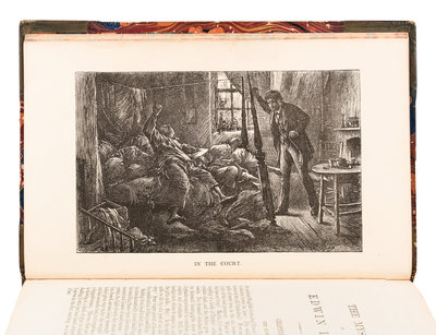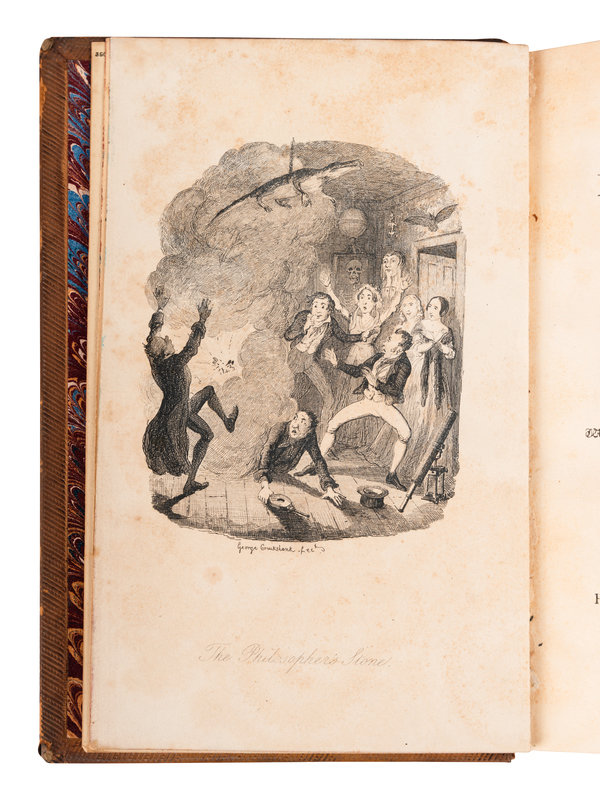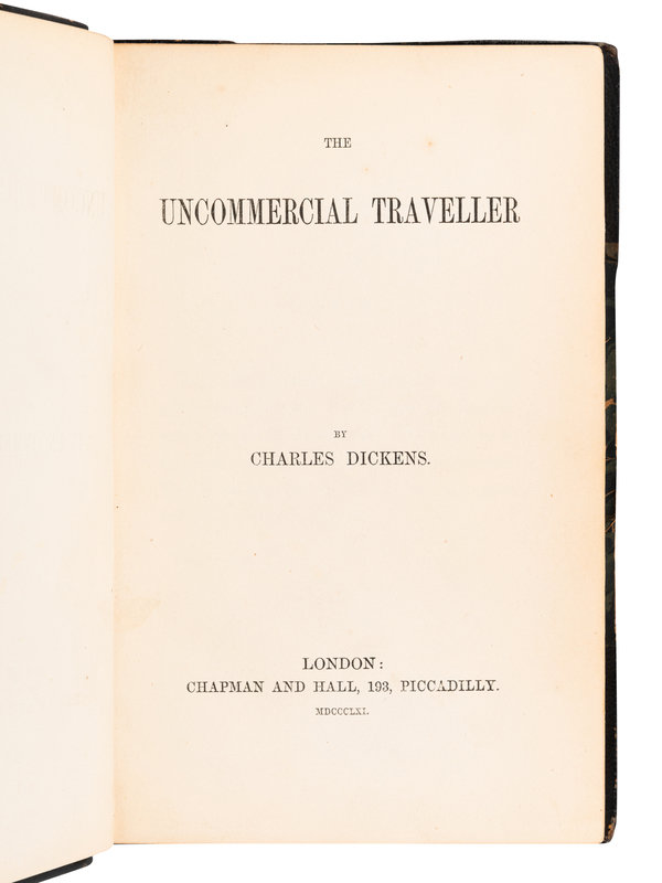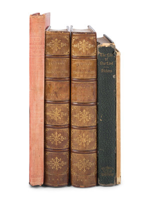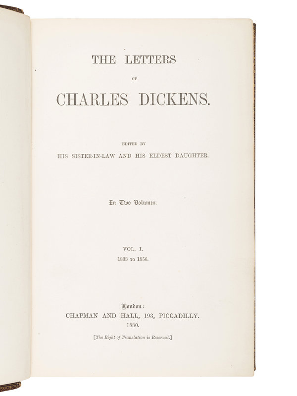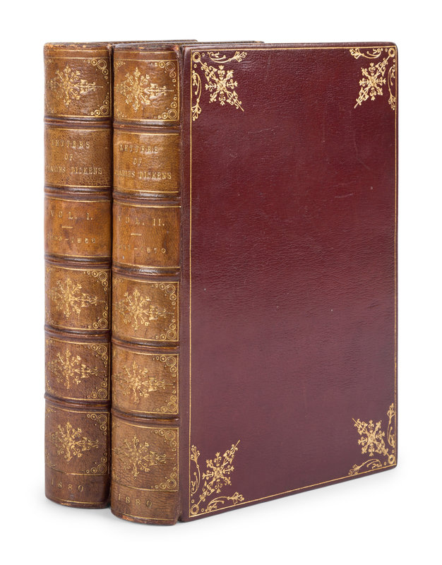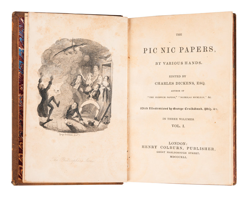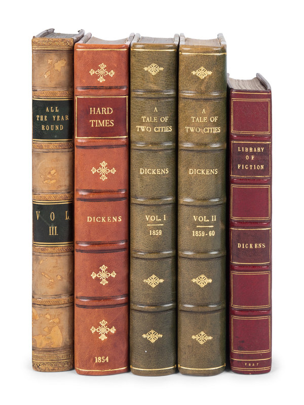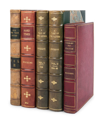 The Pic Nic Papers, by Various Hands. Charles Dickens, editor. London: Henry Colburn, 1841. 3 volumes. Contemporary calf gilt; slipcase. -- "Hard Times," In: Household Words. London: [N.p.]: 1854. -- "A Tale of Two Cities." In: All the Year Round. London: [N.p.]:1859-1860. 3 volumes. Later half calf. -- The Uncommercial Traveller. London: Chapman & Hall, 1861. Later half morocco gilt, STAMP-SIGNED BY TOUT. -- The Mystery of Edwin Drood. London: Chapman & Hall, 1870. 20th-century half calf. -- The Letters of Charles Dickens. London: Chapman & Hall, 1880. 2 volumes. 20th-century morocco gilt, original spine covers tipped-in. -- And 5 others. Together, 11 works in 15 volumes, many illustrated by George Cruikshank, all 8vo, FIRST EDITIONS or FIRST EDITIONS IN BOOK FORM, condition generally fine.