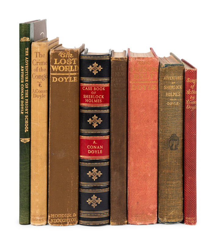 The Adventures of Sherlock Holmes. 1892. Second issue with "if he had" on p.65 line 4. -- The Case Book of Sherlock Holmes. 1927. Modern half calf gilt. -- The Lost World. [1912]. -- The Adventure of the Priory School... a Facsimile of the Original Manuscript. Len Deighton, introduction. Santa Barbara, 1985. Original half morocco gilt; slipcase. LIMITED EDITION, letter U of 26 lettered copies in deluxe binding, SIGNED BY DEIGHTON. -- And 4 others. Together, 8 works in 8 volumes, most published in New York, all 8vo, most in original cloth, most FIRST OR FIRST AMERICAN EDITIONS, condition generally good.