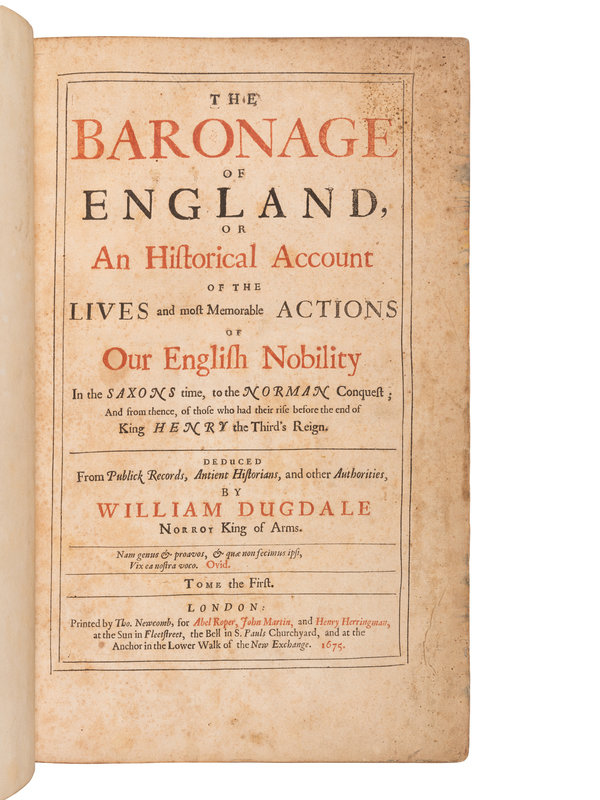 DUGDALE, William, Sir, (1605-1686). The Baronage of England. London: Printed by Thomas Newcomb for Abel Roper, John Martin, and Henry Herringman, 1675-1676.
