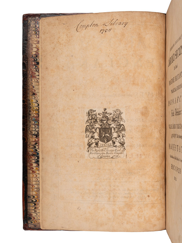 3 volumes in 2, folio. Titles printed in red and black; 5 folding genealogical tables, errata leaf (some staining and soilin). Vol I: Contemporary mottled calf gilt (rebacked and recornered preserving old lettering-piece); Vol. II: lacking covers and spine, backstrip present. Provenance: A few annotations in a contemporary hand; George Compton, 4th Earl of Northampton (bookplate).