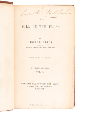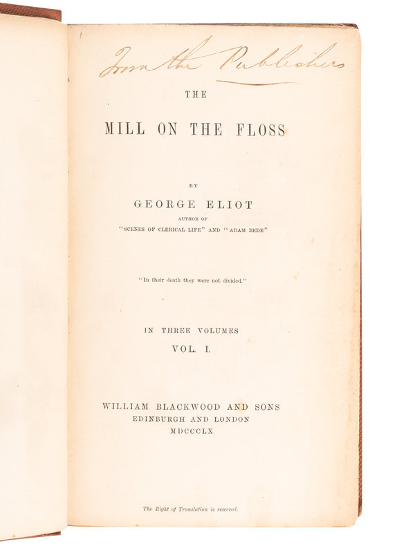 ELIOT, George (“Mary Anne Evans Lewes”) (1819-1880). The Mill on the Floss. Edinburgh & London: William Blackwood and Sons, 1860.