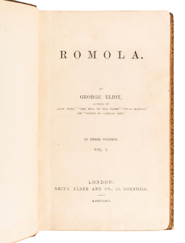 ELIOT, George (“Mary Anne Evans Lewes”) (1819-1880). Romola. London: Smith, Elder and Co., 1863.