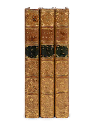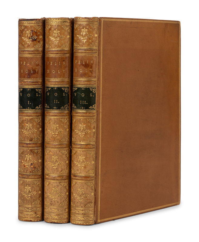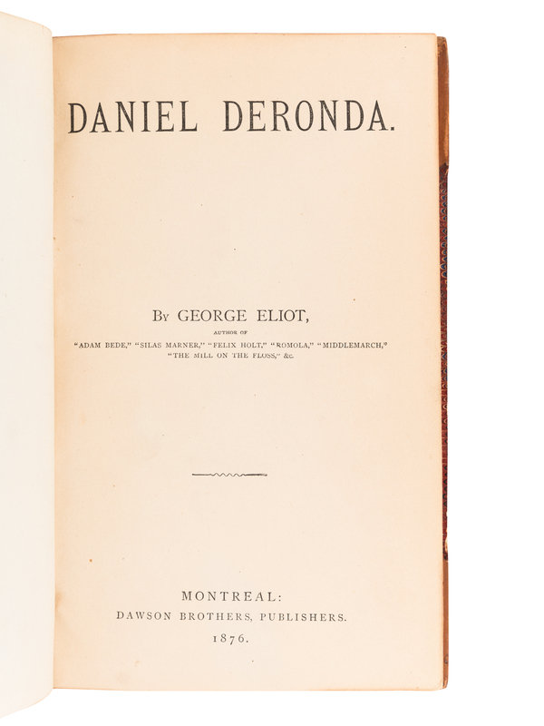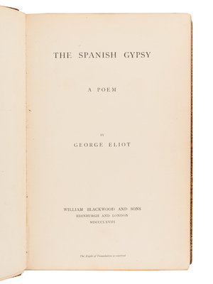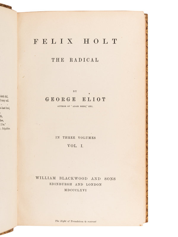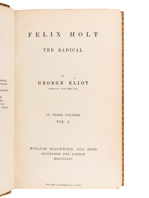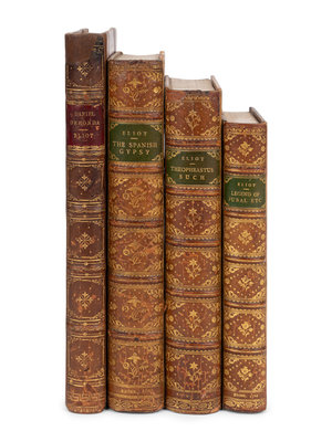 Felix Holt the Radical. 1866. 3 volumes. FIRST EDITION. Sadleir 814. -- The Spanish Gypsy. 1868. -- Daniel Deronda. Montreal, 1876. Contemporary half calf. -- The Legend of Jubal and Other Poems. 1874. -- Impressions of Theophrastus Such. 1879. -- Together, 5 works in 7 volumes, most published in Edinburgh and London by William Blackwood and Sons, all 8vo, most in contemporary calf STAMP-SIGNED BY RIVIERE & SON, most with original cloth covers bound in at rear, FIRST EDITIONS or first Canadian editions, condition generally very good.
