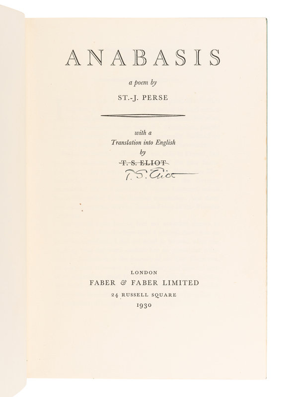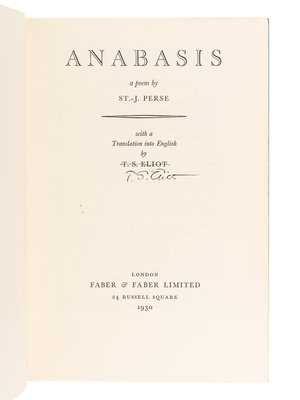 ELIOT, Thomas Stearns (1888-1965), translator. Anibasis a poem by St.-J. Perse. London: Faber & Faber Limited, 1930 [but 1937].