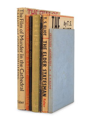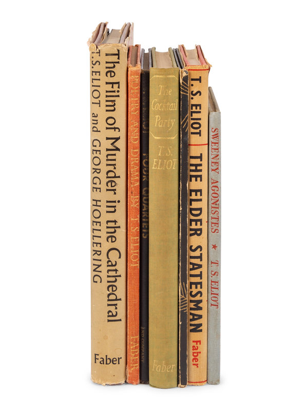 The Elder Statesman. L, 1959. In dust jacket. FIRST EDITION. -- The Cultivation of Christmas Trees. NY, 1956. FIRST AMERICAN EDITION. -- The Film of Murder in the Cathedral. L, [1952]. In dust jacket. FIRST EDITION. -- Sweeney Agonistes Fragments of an Aristophanic Melodrama. L, 1932. FIRST EDITION. -- Four Quartets. NY, [1943]. FIRST AMERICAN EDITION. -- The Cocktail Party. L, [1950]. FIRST EDITION. -- Poetry and Drama. L, [1951]. FIRST ENGLISH EDITION. -- Together, 7 works in 7 volumes, all 8vo, all in original cloth or boards, condition generally good.
