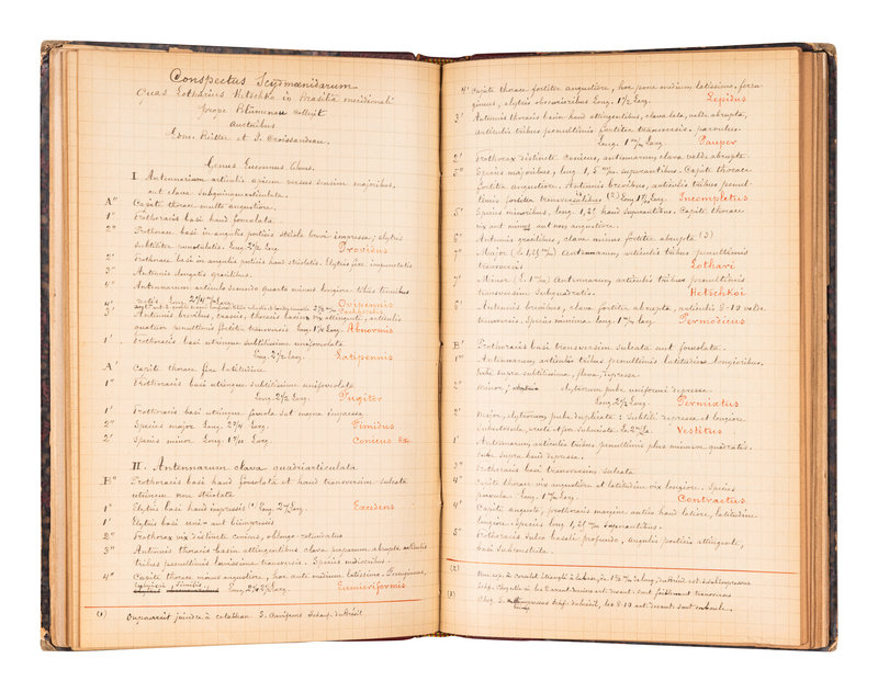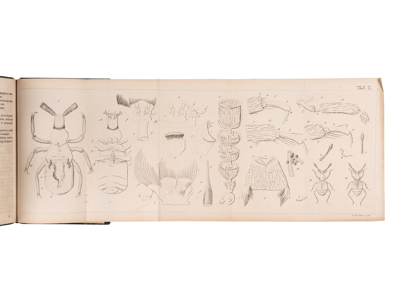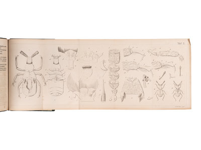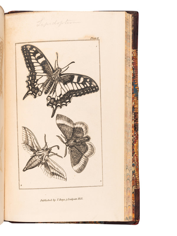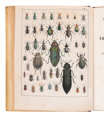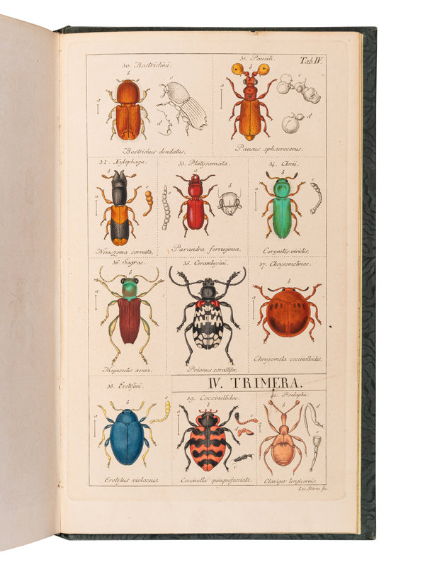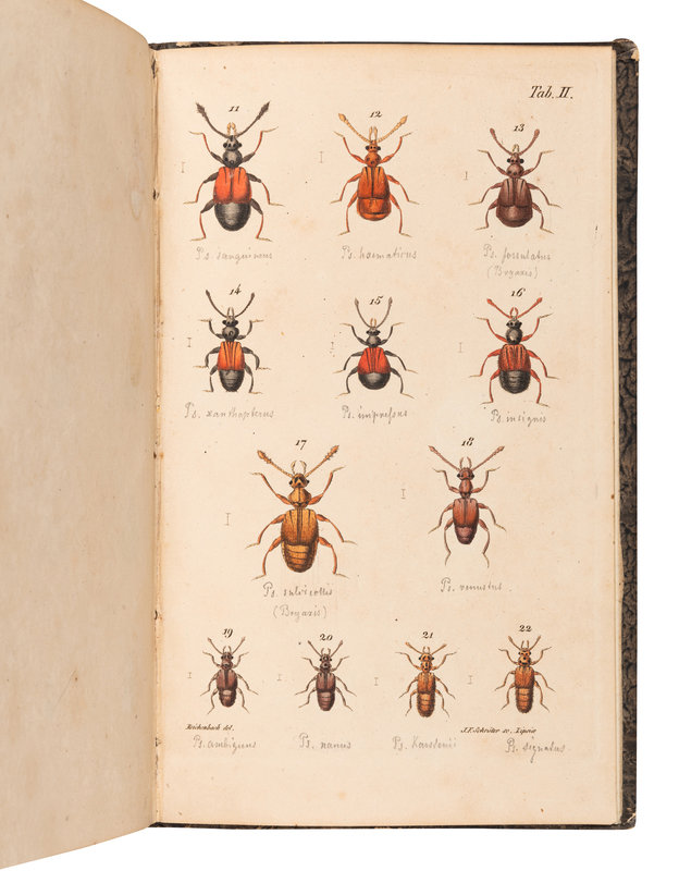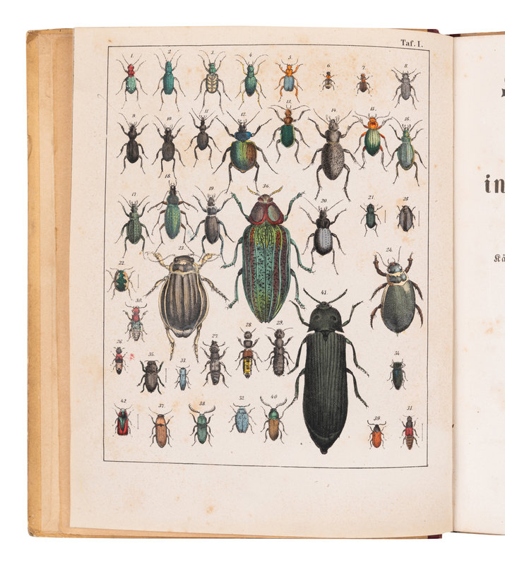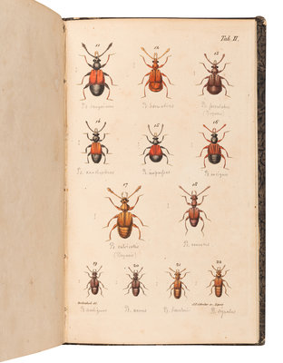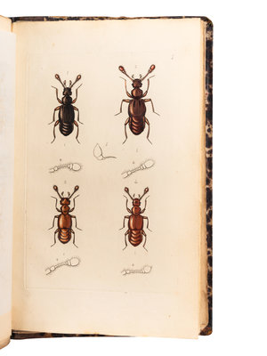 DENNY, Henry. Monographia Pselaphidarum et Scydmaenidarum Britanniae. Norwich et al, 1825. 19th-century cloth-backed boards. -- HOPE, Frederick William. “Characters and Descriptions of Several New Genera and Species of Coleopterous Insects.” In: Transactions of Zoological Society of London. Vol. I, part II, pp. 91-112. N.p., communicated 28 May 1833. Later quarter calf. PRESENTATION COPY, INSCRIBED. -- [RECICHENBACH, Heinrich Gottleib Ludwig]. Monographia Pselaphorum. Leipzig, [1816]. 19-century paste-paper covered boards. -- REBAU, Heinrich. Häfer-Büchlein oder Beschreibung der Schönsten, Nützlichsten und Schädlichsten in-und Ausländilchen Käfer. Reutlingen, ca 1850. Original cloth-backed pictorial boards. Fourth edition. -- [REITTER, Edmund]. A Sammelband of offprints on beetles published in Germany from between 1878 to 1915. 41 works bound in 3 volumes. 38pp. manuscript pages interleaved, with 4pp. manuscript folded leaf laid in to [vol. III]. Each volume bound in early 20th-century quarter red morocco. -- STURM, Jacob. Catalog meiner Insecten-Sammlung. Nürnberg, 1826. Original cloth gilt. Third edition. -- SAMOUELLE, George. The Entomologist’s Useful Compendium. L, 1819. 19th-century half polished calf gilt. -- And one other. Together, 47 works in 10 volumes, various 4to and 8vo sizes, many with engraved plates and hand-coloring, condition generally good. Provenance: one book from the collection of George Robert Waterhouse, English Naturalist (presentation inscription); three volumes from the collection of Frank C. Fletcher, American entomologist (stamps, manuscript additions).