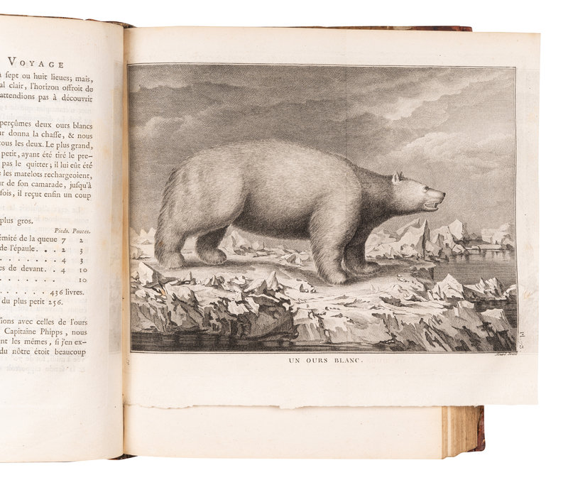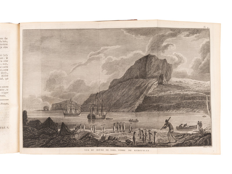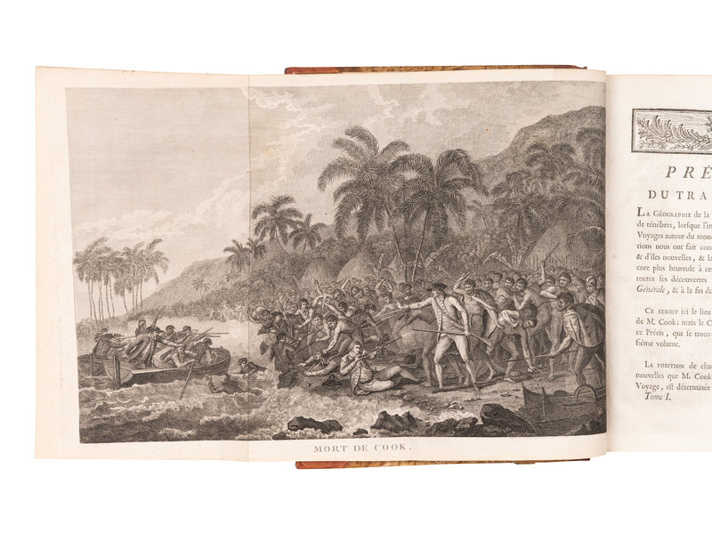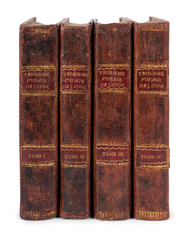 4 volumes, 4to (248 x 190 mm). 88 engraved maps, charts and plates, most folding, including the un-numbered "Mort de Cook" plate (with plate 51 misnumbered 52). Contemporary calf-backed boards, smooth spines gilt (discreet repairs to hinges and joints, some light rubbing). Provenance: Old ownership evidence excised, with leaves repaired and stamped "Removed."