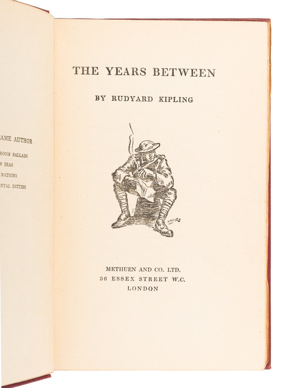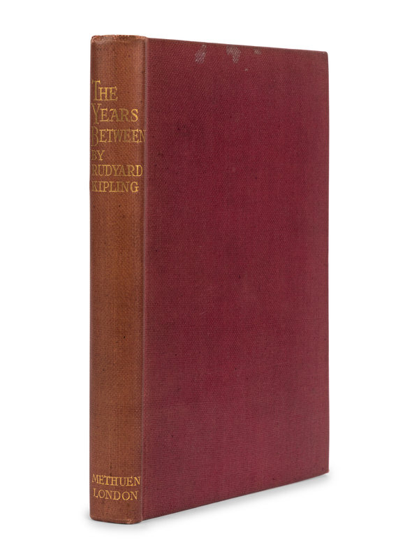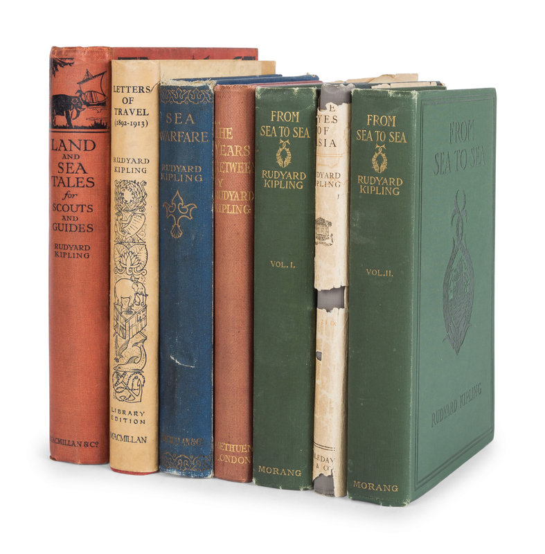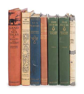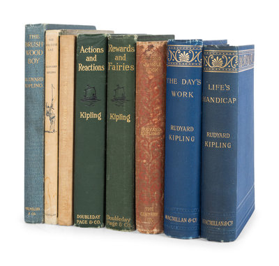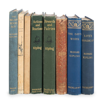 The Brushwood Boy. London: MacMillan & Co., Ltd., 1907. Publisher's light blue cloth gilt. FIRST EDITION. -- The Day's Work. London: MacMillan & Co., Ltd., 1898. Publisher's blue cloth gilt. FIRST EDITION. -- A Song of the English. London: Hodder & Stoughton, [1909]. -- Life's Handicap. London: MacMillan & Co., 1891. Publisher's blue cloth gilt. FIRST EDITION. -- Sea Warfare. London: MacMillan & Co., Ltd., 1916. Publisher's blue cloth gilt. FIRST EDITION. -- The Maltese Cat. London: MacMillan & Co., Ltd., 1955. Publisher's cream-colored cloth; original dust jacket. FIRST EDITION. -- The Second Jungle Book. New York: The Century Company, 1895. Publisher's light red cloth. -- Thy Servant a Dog. Garden City: Doubleday, Doran & Company, 1930. Publisher's beige cloth gilt. FIRST EDITION. -- And 3 others. Together, 11 works in 12 volumes, all 8vo, condition generally fine.