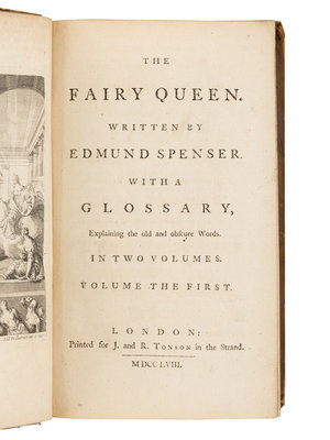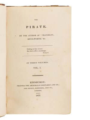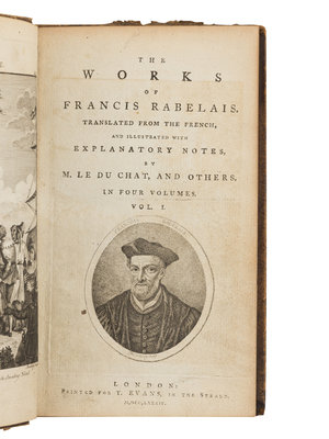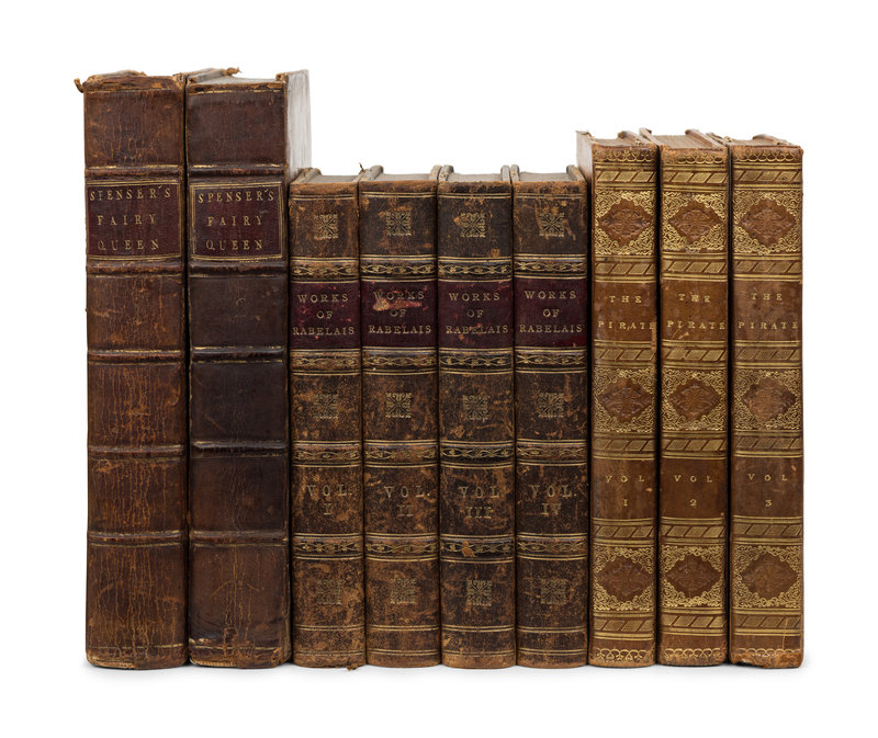 RABELAIS, Francois. Works. L, 1784. 4 volumes. ESTC T13267. -- SPENSER, Edmund. The Fairy Queen. L, 1784. 2 volumes. -- SCOTT, Walter, Sir. The Pirate. Edinburgh et al, 1822. 3 volumes. Contemporary half calf. FIRST EDITION. --Together, 3 works in 9 volumes, various 4to, 8vo and 12mo sizes, most with engraved plates, most in contemporary calf or sheep, condition generally good.