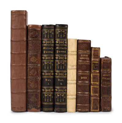 MILTON, John. A Defence of the People of England. [L or Amsterdam?],1692. Modern vellum gilt; slipcase. FIRST EDITION IN ENGLISH. -- [SWIFT, Jonathan]. A Tale of a Tub. N.p., 1711. Contemporary calf. -- DUPPA, Richard. The Life and Literary Works of Michel Angelo Buonarroti. L et al,1806. Later quarter calf, vellum gilt; folding case. -- MAGNUS, Albertus. De Secretis Mulierum. Amsterdam, 1669. Later half calf. -- The Guardian. L, 1714. Volume I only. Contemporary calf (rebacked); slipcase. FIRST EDITION IN BOOK FORM. -- And 3 others. Together, 8 works in 9 volumes, various folio, 8vo, and 12mo sizes, condition generally good. Complete list available upon request.
