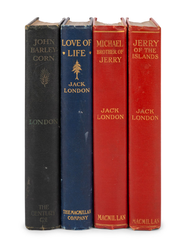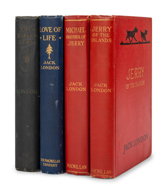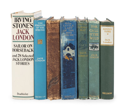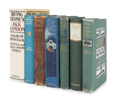 The Call of the Wild. Toronto: George N. Morang, 1903. Publisher's green cloth. First Canadian edition. -- Before Adam. Toronto: The MacMillan Company of Canada, Inc., 1907. Publisher's brown cloth. First Canadian edition. -- Adventure. London: Thomas Nelson and Sons, 1911. Publisher's green cloth. -- John Barleycorn. New York: The Century Co., 1913. Publisher's brown cloth. -- The Strength of the Strong. New York: The MacMillan Company, 1914. Publisher's blue cloth. FIRST EDITION. -- [With]: STONE, Irving. Jack London: Sailor on Horseback and 28 Selected Jack London Stories. Garden City: Doubleday and Company, Inc., 1977. Publisher's cream-colored cloth; original dust jacket. FIRST EDITION. -- And 5 others. Together, 11 works in 11 volumes, all 8vo, condition generally fine.
